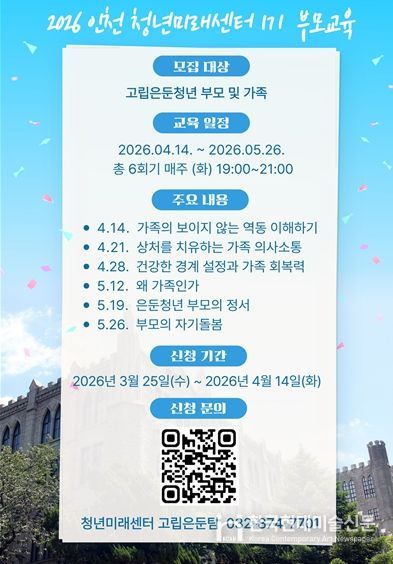 한국현대미술신문 박재남 기자 | 인천시사회서비스원 소속 인천시청년미래센터는 올해 첫 고립은둔청년 부모·가족 교육을 준비하고 참여자를 모집한다고 7일 밝혔다.