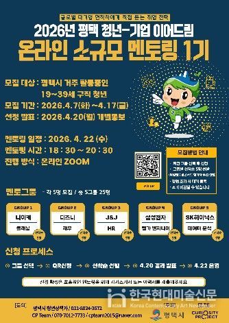 한국현대미술신문 배윤섭 기자 | 평택시는 기업 현직자들의 취업 멘토링을 통해 실질적인 취업 준비를 지원하고 인적 네트워크 형성 기회를 제공하기 위한 평택 청년-기업 이어드림 ‘온라인 소규모 멘토링 1기’ 참여자를 오는 4월17일까지 모집한다.
