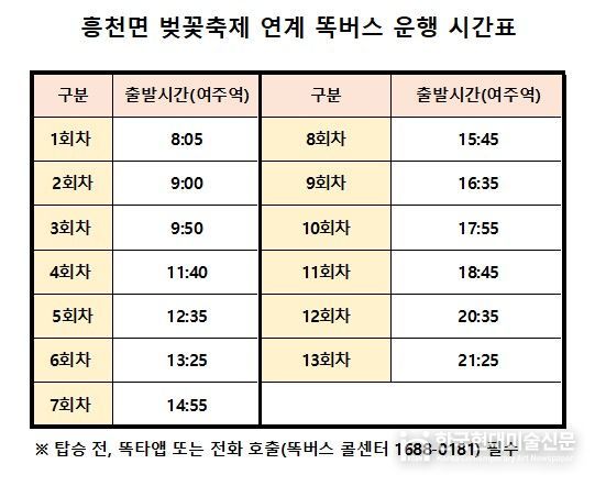 이충우 여주시장은 “흥천 남한강 벚꽃축제는 매년 수많은 인파가 몰리는 여주의 대표 축제인 만큼, 방문객들이 교통 불편 없이 축제를 즐길 수 있도록 특별 운행을 마련했다.”며, “특히 여주역에서 바로 연결되는 똑버스를 편리하게 이용해 즐거운 봄나들이 즐기시길 바란다”고 전했다.