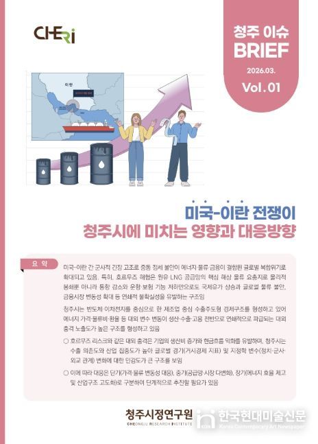 한국현대미술신문 신정은 기자 | 청주시정연구원은 미국-이란 간 군사적 충돌이 확대되는 흐름을 반영해, 청주시 경제에 미치는 영향을 정리한 이슈브리프를 발간했다고 8일 밝혔다. 이번 자료는 외부 충격이 지역 산업과 민생으로 전이되는 경로를 점검하고 대응방향을 제시했다.