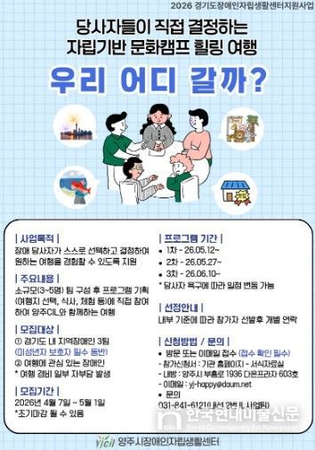 한국현대미술신문 배윤섭 기자 | 양주시장애인자립생활센터에서는 장애인 당사자가 직접 선택하고 결정하는 자립 기반 힐링 여행을 목적으로 하는 지역 장애인 문화캠프 [우리 어디 갈까?] 참가자를 모집한다.