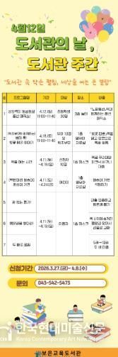 한국현대미술신문 신정은 기자 | 보은교육도서관은 오는 4월 12일부터 18일까지 ‘도서관의 날·도서관주간’을 맞아 지역 주민의 독서문화 확산을 위한 다양한 프로그램을 운영한다고 밝혔다.