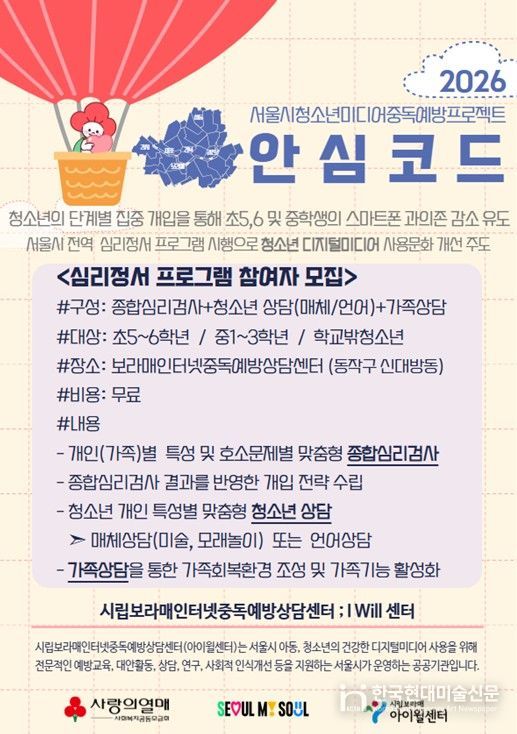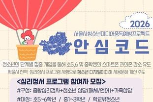 안심코드 프로그램은 올해 서울시 거주 초등학생 5~6학년 및 중학생 1~3학년, 학교 밖 청소년을 대상으로 무료 진행 중이며, 자세한 문의 및 신청은 시립보라매인터넷중독예방상담센터에서 할 수 있다.