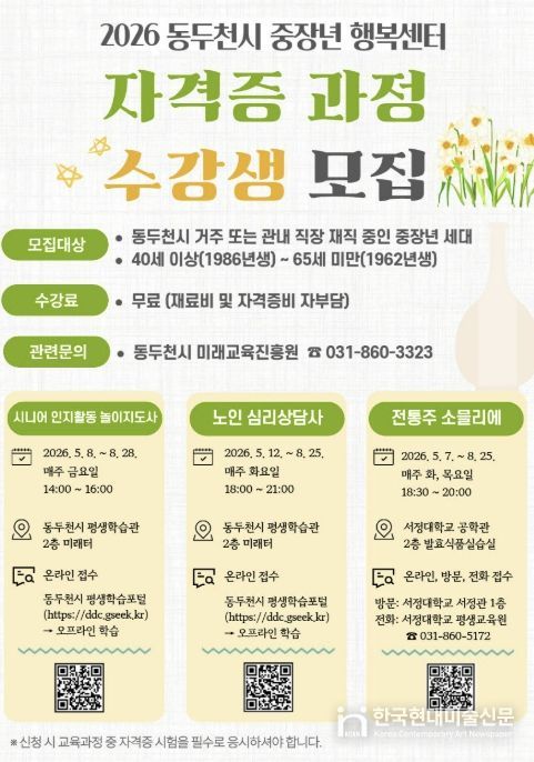 한국현대미술신문 배윤섭 기자 | 동두천시 미래교육진흥원은 지역 내 중장년층의 성공적인 인생 2막과 안정적인 사회 참여를 지원하기 위해 ‘2026년 중장년 행복센터 자격증 과정’ 수강생을 모집한다고 밝혔다.