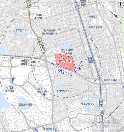 대상지는 역세권(삼양사거리역 반경 180m, 미아사거리역 반경 580m) 및 중심지 배후주거지로, 솔샘로에 면한 우수한 입지에도 불구하고 수십 년간 가로구조를 유지한 채 주거환경 노후화가 지속됐다.