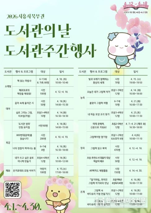 한국현대미술신문 배윤섭 기자 | 시흥시 북부권 공공도서관은 4월 12일 ‘도서관의 날’과 4월 12일부터 18일까지 이어지는 ‘도서관주간’을 기념해 다양한 독서문화 행사와 현장 참여 이벤트를 4월 한 달간 운영한다.