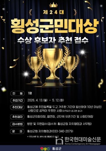 한국현대미술신문 원진 기자 | 횡성군은'제24대 횡성군민대상'후보자를 4월 13일부터 5월 12일까지 추천받는다.