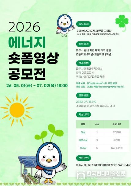 한국현대미술신문 배윤섭 기자 | 파주시는 청소년들의 에너지 인식을 제고하고 디지털 미디어 활용 역량을 강화하기 위해 녪년 파주시 청소년 에너지 숏폼 영상 공모전’을 개최한다.