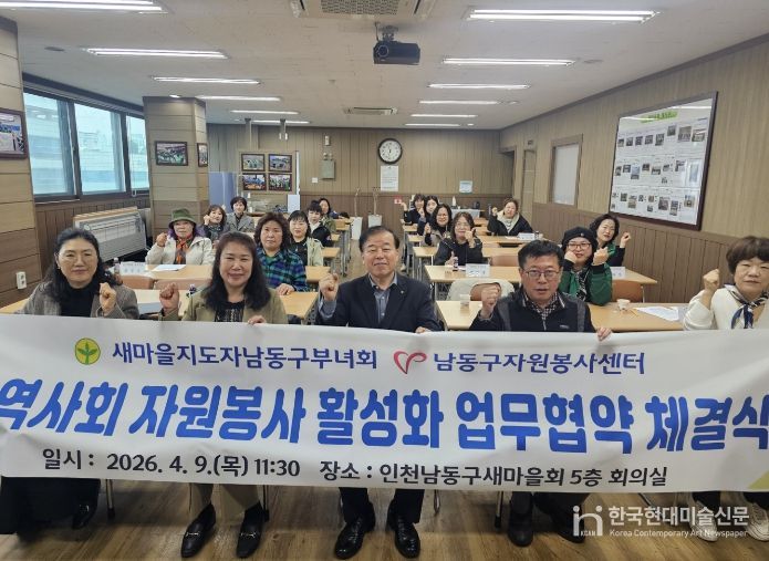 한국현대미술신문 박재남 기자 | 인천시 남동구 새마을지도자남동구부녀회는 남동구자원봉사센터와 최근 인천남동구새마을회 5층 회의실에서 지역사회 자원봉사 활성화를 위한 업무협약(MOU)을 체결했다고 13일 밝혔다.