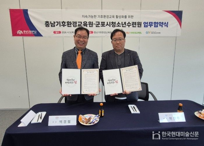 한국현대미술신문 배윤섭 기자 | (재)군포시청소년재단이 운영하는 군포시청소년수련원(충남 청양)과 충남기후환경교육원(충남 청양)은 4월 9일, 미래세대의 지속가능 기후환경교육 활성화를 위한 업무협약을 체결했다고 전했다.