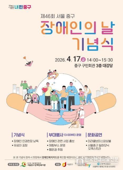 한국현대미술신문 배건 기자 | 서울 중구가 오는 17일 오후 2시, 중구구민회관 3층 대강당에서 '제46회 장애인의 날 기념식'을 개최한다.