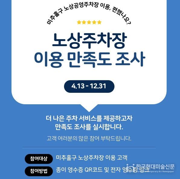 한국현대미술신문 박재남 기자 | 인천 미추홀구시설관리공단은 노상공영주차장 이용 고객의 다양한 의견을 수렴하고 서비스 품질을 향상하기 위해 ‘고객 만족도 조사’를 실시한다고 밝혔다.