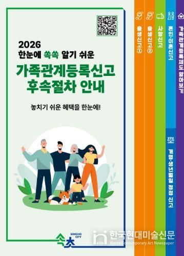 한국현대미술신문 원진 기자 | 속초시는 가족관계등록신고 이후 필요한 각종 후속 행정절차를 시민들이 보다 쉽고 편리하게 이해하고 이행할 수 있도록 가족관계등록신고 후속절차 안내 리플릿을 제작해 시청 종합민원실과 8개 동 주민센터에 배포한다.
