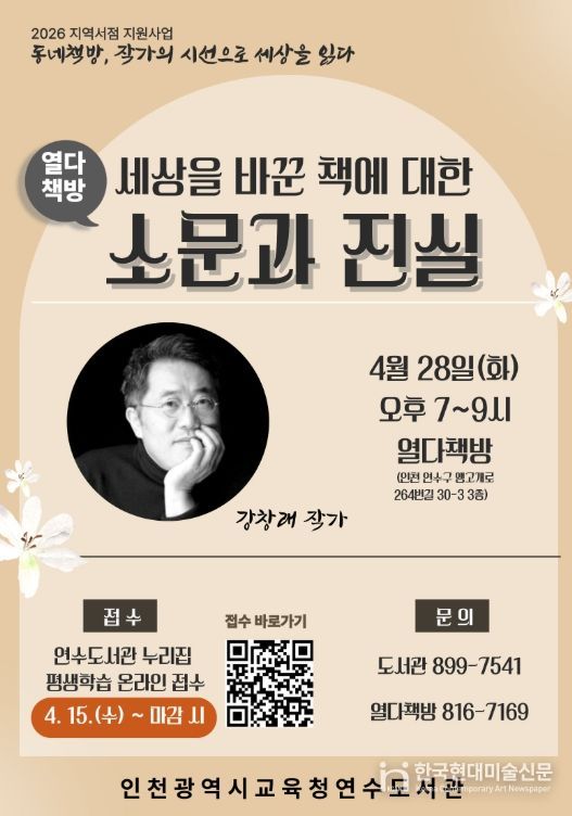 한국현대미술신문 박재남 기자 | 인천광역시교육청연수도서관은 지역사회 독서문화를 확산하고 동네책방과의 협력을 강화하기 위해 28일 지역서점 ‘열다책방’에서 강창래 작가와 함께하는 특별 강연을 운영한다.