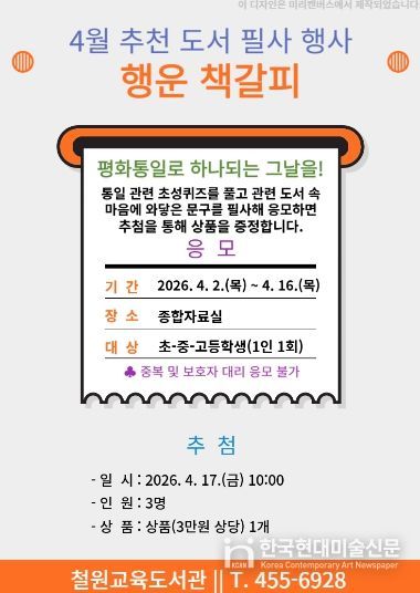 한국현대미술신문 원진 기자 | 철원교육도서관(관장 김민서)은 4월부터 11월까지 종합자료실에서 지역 초·중·고 학생을 대상으로 추천 도서 필사 행사 ‘행운 책갈피’를 8회 운영한다.