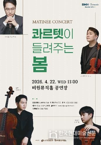 한국현대미술신문 정소영 기자 | 비원뮤직홀에서는 오전이 여유로운 관객들을 위한 마티네 콘서트 ‘콰르텟이 들려주는 봄’을 오는 4월 22일 개최한다.
