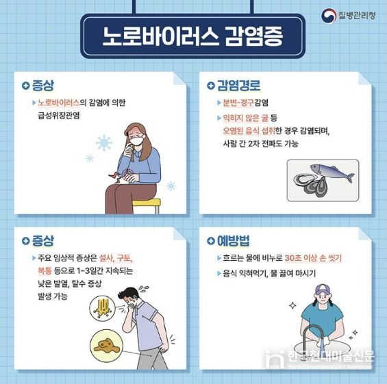 노로바이러스 감염증은 노로바이러스에 의한 급성 위장관염으로 수인성 매개 감염병이며. 10~100개의 소량으로도 감염력이 높아 집단 구토·설사를 일으킬 수 있다.