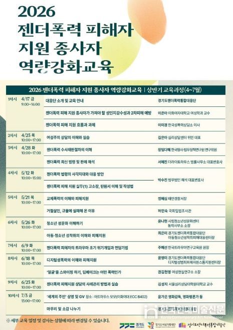 한국현대미술신문 배윤섭 기자 | 경기도와 경기도젠더폭력통합대응단이 17일 도내 젠더폭력 피해 지원 현장 종사자들의 전문성 향상을 위한 ‘2026 역량강화 교육’ 상반기 과정을 시작하며 현장 대응력 강화에 나섰다.
