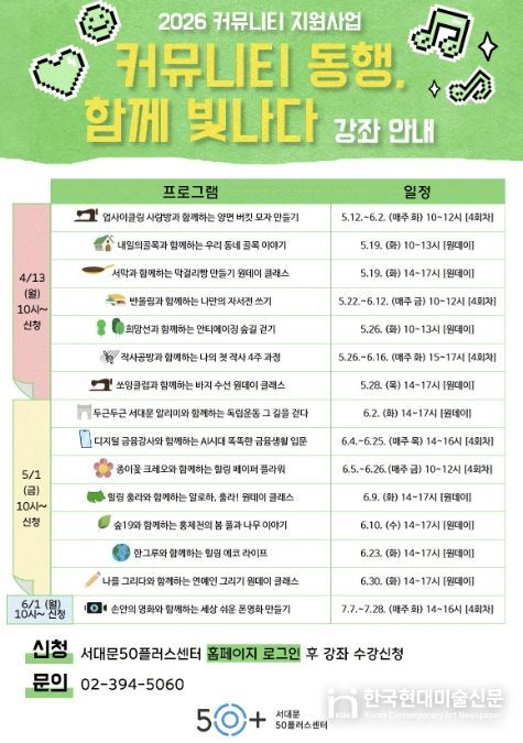 한국현대미술신문 배건 기자 | 서대문구가 운영하는 서대문50플러스센터가 중장년의 자기 계발과 사회참여를 지원하는 교육 프로그램 ‘커뮤니티 동행, 함께 빛나다’를 센터 내 강의실과 야외 현장에서 5∼7월 운영한다.