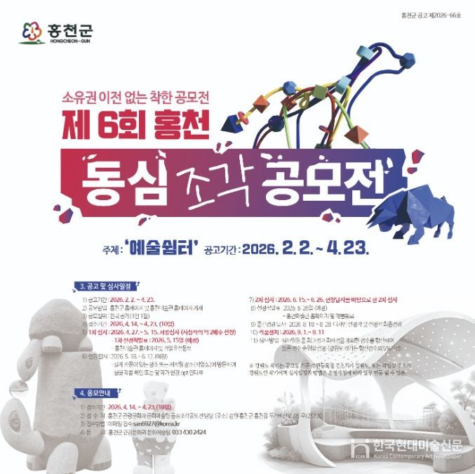 한국현대미술신문 원진 기자 | 홍천군은 자연 속에서 머물며 쉬어갈 수 있는 공공예술 공간 조성을 위해 '제6회 홍천동심조각공모전' 작품을 모집한다. 작품 접수는 2026년 4월 23일까지 진행한다.