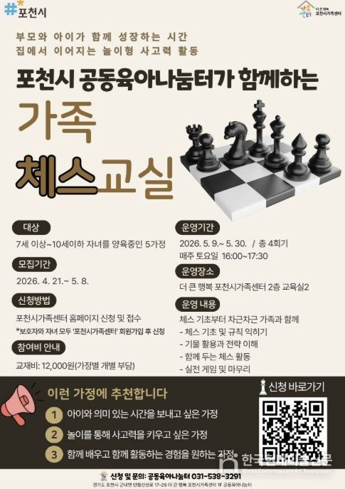 한국현대미술신문 배윤섭 기자 | 포천시 더 큰 행복 포천시가족센터는 공동육아나눔터 상시 프로그램의 일환으로 아동의 논리적 사고력 향상과 부모-자녀 간 긍정적 상호작용을 지원하기 위해 가족 참여형 체스 프로그램 '가족 체스 교실'을 운영한다고 밝혔다.