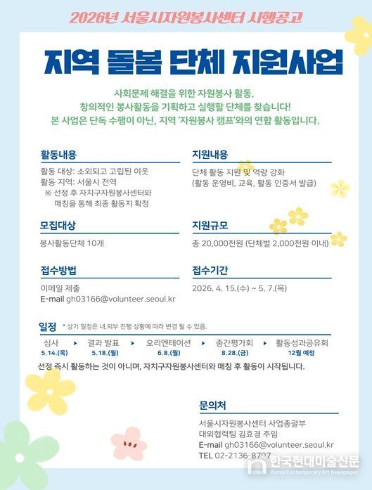 한국현대미술신문 배건 기자 | 서울시자원봉사센터는 복지 사각지대 주민의 외로움 해소를 위해 자치구자원봉사센터(자원봉사 캠프)와 협력하여 신규 봉사활동을 기획하고 운영할 비영리 단체를 모집한다고 밝혔다.