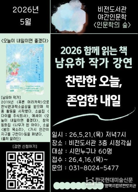 한국현대미술신문 배윤섭 기자 | 평택시립 비전도서관은 오는 5월 21일 저녁 7시 남유하 작가를 초청하여 ‘찬란한 오늘, 존엄한 내일’을 주제로 야간 인문학 강연을 진행한다.