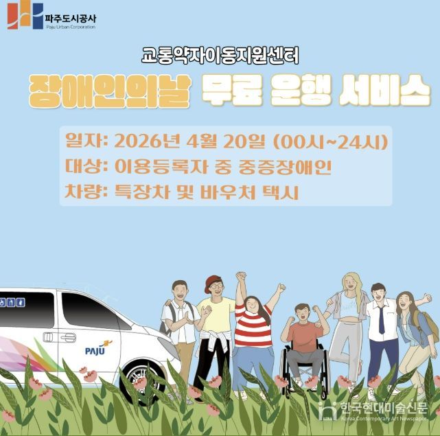 한국현대미술신문 배윤섭 기자 | 파주도시공사 교통약자이동지원센터에서는 오는 4월 20일 장애인의 날을 맞아 교통약자를 위한 무료 운행 서비스를 실시한다.