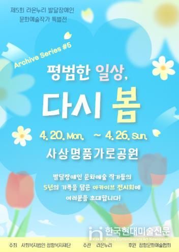 한국현대미술신문 정소영 기자 | 부산 사상구는 장애인거주시설 라온누리(엄궁동)가 오는 4월 20일부터 26일까지 사상 명품가로공원 일대에서 제5회 라온누리 발달장애인 문화예술 작가 특별전 ‘평범한 일상, 다시 봄’을 개최한다고 밝혔다.