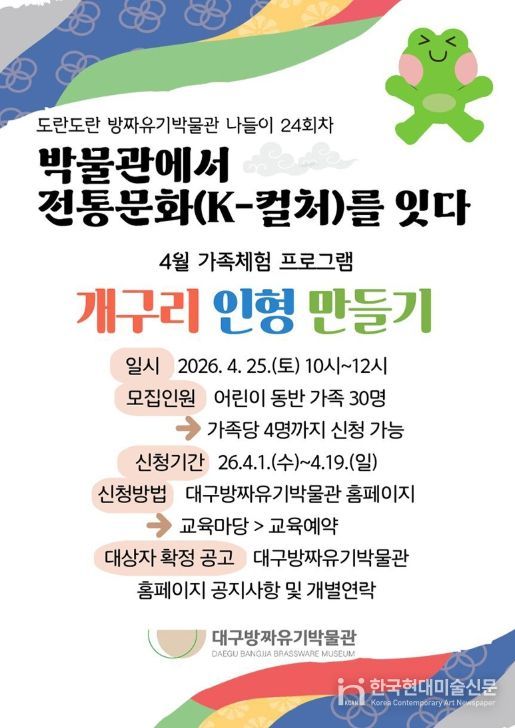 한국현대미술신문 정소영 기자 | 대구문화예술진흥원 박물관운영본부 소속 대구방짜유기박물관은 화창한 봄날 4월에 전통공예 가족체험과 팔공산 역사문화 이해 특강을 기획하여, 4월 25일 오전 10시에 ‘개구리 인형 만들기’ 체험을, 4월 28일 오후 2시에 ‘고려 태조 왕건 후백제 견훤과 팔공산’ 강의를 개최한다.