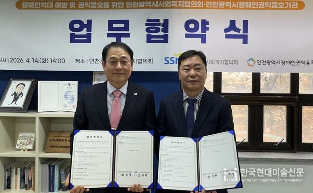 한국현대미술신문 박재남 기자 | 인천시사회서비스원 소속 인천시장애인권익옹호기관은 인천시사회복지협의회와 손잡고 장애인 학대 예방과 대응 체계 강화에 힘을 모은다고 19일 밝혔다.