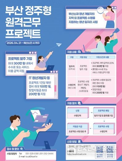 한국현대미술신문 정소영 기자 | 부산시는 지역 청년 아이티(IT) 인력이 부산에 거주하면서 국내외 기업의 프로젝트를 수행할 수 있도록 지원하는 '부산형 마이크로 일자리 기반 정주형 원격근무 프로젝트' 사업을 전국 최초로 올해 시범 추진한다고 밝혔다.
