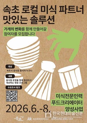 한국현대미술신문 원진 기자 | 재단법인 속초문화관광재단이 ‘맛으로 엮어가는 도시의 멋, 음식문화도시 속초’를 비전으로 지역 음식문화 활성화와 음식점 경쟁력 강화를 위한 ‘미식 전문인력 푸드크리에이터 양성사업’을 추진한다. 이에 앞서 속초시에 사업장을 둔 음식점 종사자와 관계자를 대상으로 4월 30일까지 사전 수요조사를 실시한다.