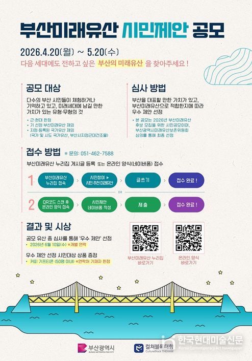한국현대미술신문 정소영 기자 | 부산시는 시민이 직접 지역의 문화유산을 찾아내어 다음 세대와 공유할 수 있도록 '부산미래유산' 시민제안 공모를 시행한다고 밝혔다.