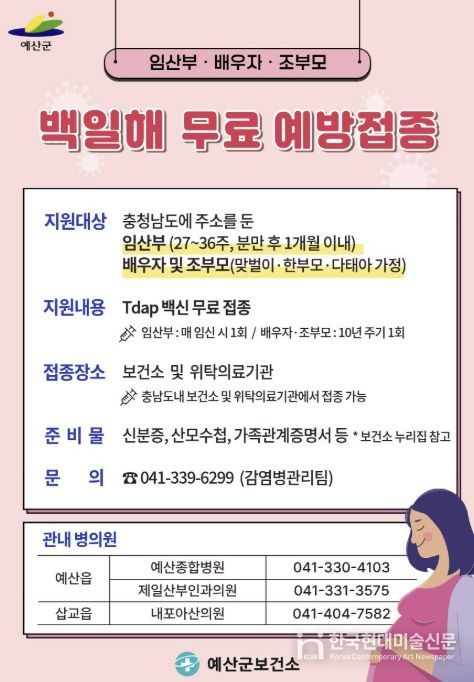 한국현대미술신문 신정은 기자 | 예산군은 건강한 출산과 양육 환경 조성을 위해 백일해 무료 예방접종 지원 사업을 확대 시행하고 있다.