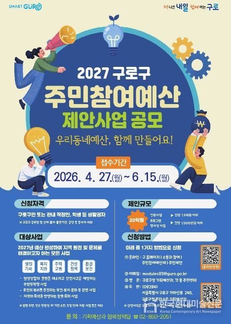 한국현대미술신문 배건 기자 | 구로구가 2027년 예산에 편성할 ‘주민참여예산 사업 공모’를 4월 27일부터 6월 15일까지 진행한다.