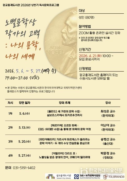 한국현대미술신문 배윤섭 기자 | 수원시 광교홍재도서관이 한국외국어대학교와 협력해 진행하는 2026년 세계문화기행 시리즈 1편 ‘노벨문학상 작가의 고백 : 나의 문학, 나의 세계’ 강좌를 수강할 시민을 모집한다.