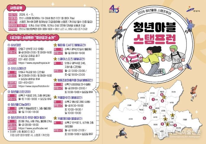 한국현대미술신문 배윤섭 기자 | 안산시는 청년의 시정 참여를 확대하고 청년공간과 정책에 대한 접근성을 높이기 위해 청년활동 스탬프투어 ‘청년마블 스탬프런’ 사업을 운영한다고 20일 밝혔다.