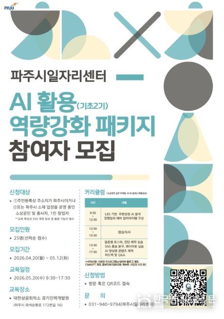 모집 기간은 4월 20일부터 5월 12일까지이며, 교육은 5월 20일 경기인력개발원에서 하루 7시간 과정으로 진행된다. 모집 대상은 파주시 관내 소상공인으로, 총 25명을 선착순 모집한다. 자세한 사항은 파주시청 누리집을 참고하거나 파주시 일자리센터로 문의하면 상세히 안내받을 수 있다.