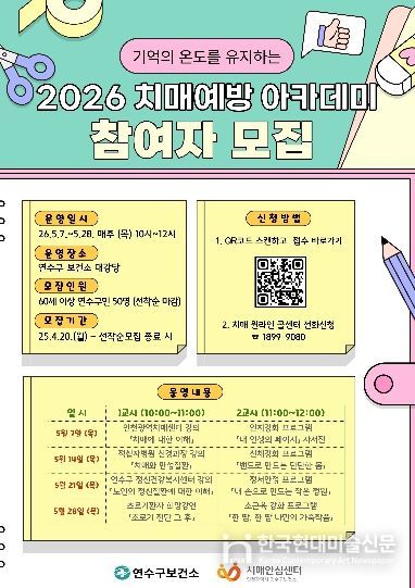 한국현대미술신문 박재남 기자 | 연수구는 다음 달 7일부터 28일까지 치매 발병 지연과 예방을 위한 ‘2026 치매예방 아카데미’를 운영한다.