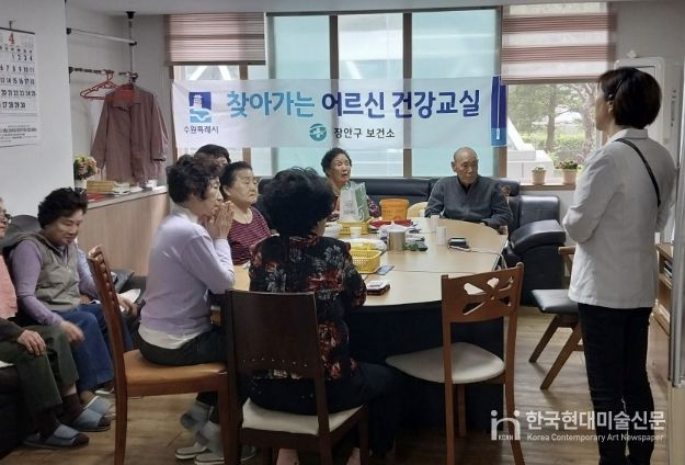 한국현대미술신문 배윤섭 기자 | 수원시 장안구 송죽동은 지난 17일, 관내 로얄팰리스 경로당에서 '찾아가는 어르신 건강교실' 프로그램을 운영했다.