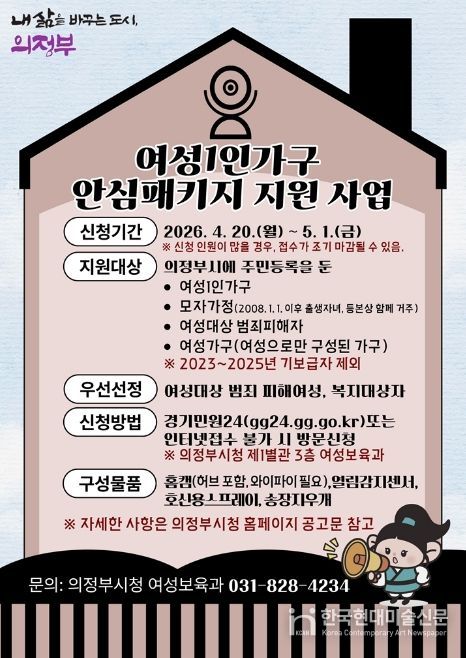 한국현대미술신문 배윤섭 기자 | 의정부시는 4월 20일부터 5월 1일까지 12일간 온․오프라인을 통해 여성 1인 가구 안심패키지 지원사업의 신청을 접수한다.