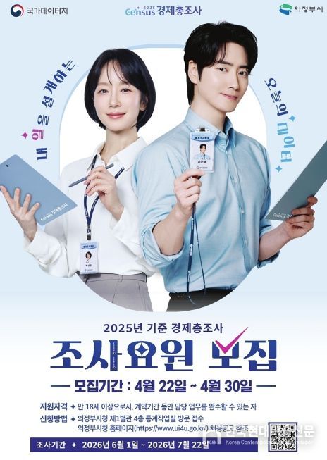 한국현대미술신문 배윤섭 기자 | 의정부시는 6월 1일부터 실시되는 ‘2025년 기준 경제총조사’의 원활한 추진을 위해 조사요원 77명을 모집한다.