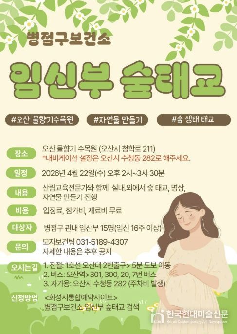 한국현대미술신문 배윤섭 기자 | 화성특례시 병점구보건소는 임신부의 정서적 안정과 건강한 출산을 지원하기 위해 오는 22일 ‘임신부 숲태교 프로그램’을 운영한다고 밝혔다.