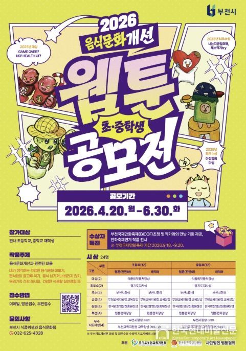 한국현대미술신문 배윤섭 기자 | 부천시는 4월 20일부터 6월 30일까지 ‘2026년 음식문화개선 초중학생 웹툰·캐릭터 공모전’을 연다. 이번 공모전은 학생들이 일상 속 음식문화를 주제로 직접 창작에 참여함으로써 올바른 식문화에 대한 인식을 높이기 위해 매년 추진되고 있다.