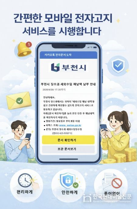 한국현대미술신문 배윤섭 기자 | 부천시는 이달 20일부터 시민 납세 편의를 높이고 고지서 전달의 정확성을 강화하기 위해 세외수입(일반회계) 체납안내문을 카카오톡으로 발송하는 모바일 전자고지 서비스를 시행한다.
