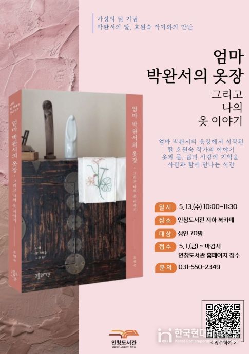 한국현대미술신문 배윤섭 기자 | 구리시립도서관은 '호원숙 작가와의 만남 ‘엄마 박완서의 옷장, 그리고 나의 이야기’' 참여 신청을 오는 5월 1일부터 접수한다고 밝혔다.