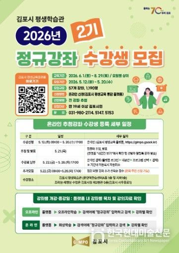 한국현대미술신문 배윤섭 기자 | 김포시가 시민의 평생학습 참여 기회를 확대하고 변화하는 사회 환경에 대응할 수 있는 역량 강화를 위해 ‘2026년 2기 평생교육 정규강좌’ 수강생을 모집한다고 밝혔다.