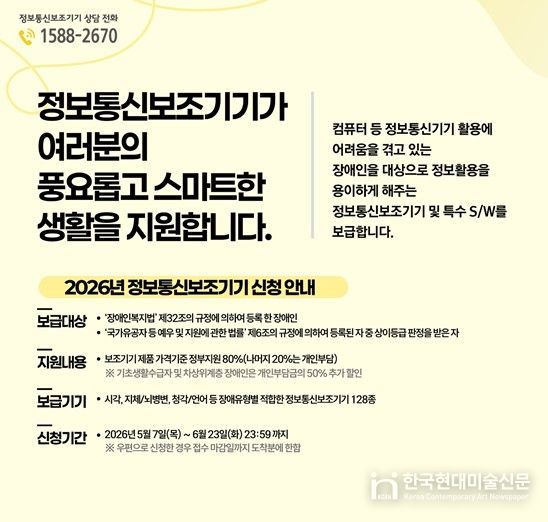 신청은 5월 7일부터 6월 23일까지 정보통신보조기기 누리집을 통한 온라인 접수 또는 자치구 방문, 우편으로 가능하다. 대상자는 장애 정도와 소득 수준, 기존 지원 이력 등을 종합적으로 고려해 선정된다.