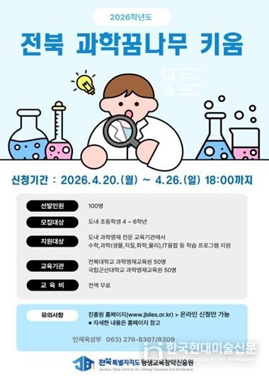 한국현대미술신문 기자 | 전북특별자치도평생교육장학진흥원은 도내 초등학생들의 과학적 잠재력을 깨우고 미래 혁신 인재로 육성하기 위한 2026년도 ‘전북 과학꿈나무 키움사업’ 참가자를 오는 4월 20일부터 26일까지 모집한다고 밝혔다.